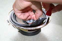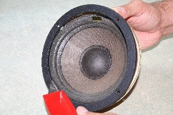 |  HAAL DE WOOFER UIT DE KAST. Neem de juiste schroevendraaier en haal de woofer uit de kast. Pas op dat je niet per ongeluk de woofer beschadigt! Maak de kabels los van de woofer en markeer de polariteit van de kabels. Het is heel belangrijk dat de kabels weer op dezelfde wijze worden aangesloten na de operatie. Als je de kabels moet 'los solderen' pas dan op dat je de terminals niet teveel verhit. | ||||||||