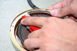 | STAP VIER: LIJM DE RAND OP DE WOOFER. Breng lijm aan op de nieuwe luidsprekerrand en verspreid het. Breng ook lijm aan op de woofer. Zorg dat de lijm op de woofer niet 'uitloopt'. Breng de nieuwe luidsprekerrand aan midden op de woofer. Druk zachtjes aan. Neem de tijd, werk langzaam en nauwkeurig. Het verdient aanbeveling om een 'ring' te gebruiken (bijvoorbeeld een pan / schaal) die je op de rand kunt leggen die continu druk uitoefent. Op die manier krijg je een perfecte hechting van de lijm. Professionals gebruiken hiervoor cirkelvormige mallen die ze op de gelijmde rand leggen met daarop iets van gewicht. (Zorg dat het gewicht niet te groot is - 500 gr. is veelal meer dan voldoende....) Soms moet de rand achter de conus gemonteerd worden. | ||||||||