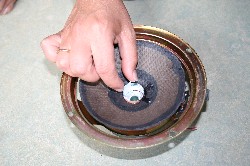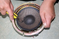 |  VERWIJDER DE STOFKAP. LET OP: VEELAL (99,9%) IS DEZE STAP NIET NODIG en volstaat STAP 5! Leg de woofer horizontaal op de rug. Beweeg de conus neerwaarts volgens een rechte lijn. Voel je weerstand of hoor je iets schrapen - verwijder dan de stofkap - je moet de woofer opnieuw uitlijnen (stap 5). Voel je geen weerstand en kan je de conus vrijelijk indrukken dan is de centreerring nog goed en is de woofer nog gecentreerd. Je kunt de stofkap op zijn plaats laten - tenzij de stofkap beschadigd is en je de stofkap daarom wilt vervangen. | ||||||||